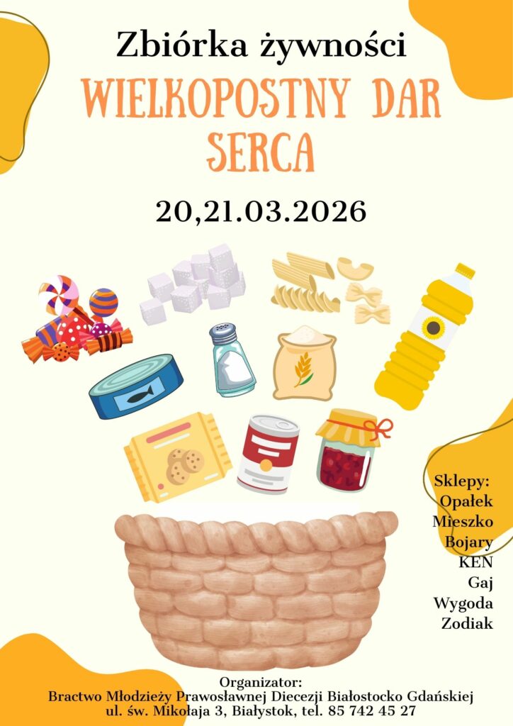 Z błogosławieństwa Jego Ekscelencji Najprzewielebniejszego Jakuba, Arcybiskupa Białostockiego i Gdańskiego, Bractwo Młodzieży Prawosławnej Diecezji Białostocko-Gdańskiej po raz kolejny organizuje Zbiórkę Żywności „Wielkopostny Dar Serca”. Odbędzie się ona w terminie 20-21 marca 2026 roku, na terenie białostockich sklepów sieci PSS Społem. Wolontariuszy będzie można spotkać w sklepach, w następujących godzinach:
