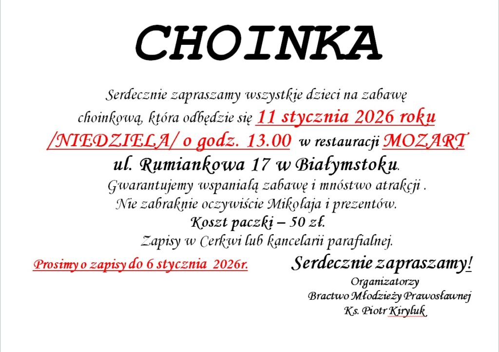 Zapraszamy wszystkie dzieci na zabawę choinkową, która odbędzie się 11 stycznia 2026 r. (niedziela) o godz. 13:00 w restauracji Mozart przy ul. Rumiankowej 17 w Białymstoku.